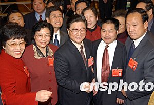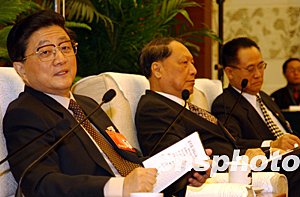 今天是十屆全國(guó)人大第一次會(huì)議河北團(tuán)全體會(huì)議,中共中央政治局常委黃菊與代表們共同審議。