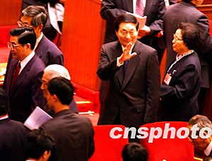 朱鎔基總理三月十四日在北京人民大會堂出席十屆全國政協(xié)一次會議閉幕式,最后離場時俯身抱拳向委員們祝福。