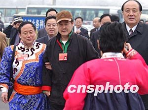全國人大代表趙本山三月十五日前往北京人民大會(huì)堂參加十屆人大一次會(huì)議的選舉,一邊走一邊應(yīng)其他代表的請(qǐng)求合影。作者:賈國榮