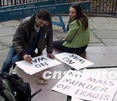 三月十七日在聯(lián)合國安理會為避免戰(zhàn)爭竭盡所能之時,守候在聯(lián)合國大樓外的反戰(zhàn)者書寫反戰(zhàn)標語,為阻止戰(zhàn)爭做最后努力。作者:趙海燕