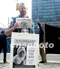 當(dāng)?shù)貢r間三月十七日上午,聯(lián)合國內(nèi)伊拉克問題上的外交斗爭正式結(jié)束。美、英、西宣布,放棄在安理會上對伊拉克最后通牒議案進行表決的努力。在聯(lián)合國總部門前,一名反戰(zhàn)者身掛伊拉克殘疾少女畫像的表語牌,上書:“為抓住薩達姆,你想殺死她嗎”?作者:陳