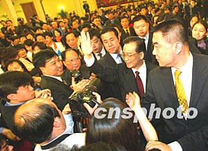 十屆全國人大一次會議十八日在北京人民大會堂閉幕,溫家寶在記者招待會后,欣然走下臺與記者們打招呼,引起現(xiàn)場混亂。作者:毛建軍