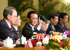三月十八日,十屆全國(guó)人大一次會(huì)議閉幕后,新任國(guó)務(wù)院總理溫家寶和四位副總理一起與中外記者見面。作者:張煒