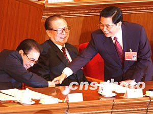 新當(dāng)選的中國(guó)國(guó)家主席胡錦濤,三月十八日在十屆人大一次會(huì)議的閉幕式上,向九屆全國(guó)人大委員長(zhǎng)李鵬握手致謝。作者:賈國(guó)榮