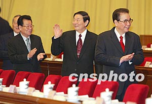 十屆人大一次會(huì)議十八日上午在北京人民大會(huì)堂閉幕,李鵬、朱镕基、李瑞環(huán)等到會(huì)祝賀。作者:毛建軍