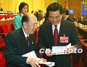 十屆人大一次會(huì)議十八日上午在北京人民大會(huì)堂閉幕,參加閉幕會(huì)的馬萬(wàn)祺請(qǐng)胡錦濤主席看他的新詩(shī)作。作者:毛建軍