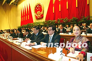 十屆人大一次會議十八日上午在北京人民大會堂閉幕,圖為刀美蘭、于均波、習近平(從右至左)等代表們按表決器通過各項決議。作者:毛建軍
