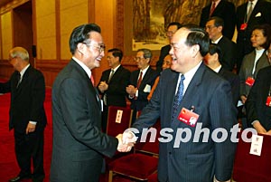 吳邦國委員長十八日下午在北京人民大會堂會見出席十屆人大一次會議的港澳代表,圖為吳邦國與澳門代表賀一誠握手。作者:毛建軍