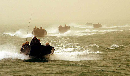 英國海軍陸戰(zhàn)隊(duì)突擊兵和美國海軍陸戰(zhàn)隊(duì)員們想重演二戰(zhàn)時(shí)西西里島登陸戰(zhàn)的場(chǎng)面,可伊拉克軍隊(duì)卻不配合:當(dāng)?shù)貢r(shí)間20日晚,科威特北部的美英重炮部隊(duì)、阿拉伯灣北部水域的海軍艦炮、巡航導(dǎo)彈和美國航母起飛的艦載機(jī)同時(shí)對(duì)伊拉克第二大城市巴士拉的戰(zhàn)略門戶――法奧半島進(jìn)行了煞有介事的狂轟濫炸。