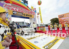中國臺北車手林志穎作為佳通輪胎形象代言人,參加2003年中國汽車拉力賽上海站比賽。在22日發(fā)車儀式上,由上海靚女陪伴準備發(fā)車。作者:趙振清