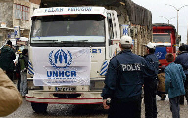 聯(lián)合國(guó)難民署的第一支救援車隊(duì)24日到達(dá)土耳其和伊拉克邊界小鎮(zhèn)錫洛皮,為已在那里建立的準(zhǔn)備接受伊拉克難民的營(yíng)地提供物資。