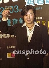 歌星王杰3月28日在香港出席“Neway一夜情歌王杰演唱會(huì)”記者會(huì)。是次演唱會(huì)將以“一夜情歌”作主題會(huì)歌迷,以獨(dú)特風(fēng)格,為歌迷帶來(lái)驚喜,圖為王杰為預(yù)祝個(gè)唱成功舉杯。鄧慶樂(lè) 攝
