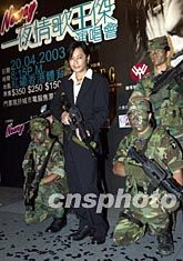 歌星王杰3月28日在香港出席「Neway 一夜情歌王杰演唱會(huì)」記者會(huì)。大會(huì)特別安排幾位身穿迷彩軍服手持步槍的臨時(shí)演員為宣傳演唱會(huì)增添氣氛。演唱會(huì)定于4月20日于紅館舉行。鄧慶樂(lè) 攝