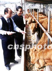 山東省棗莊市山亭區(qū)農(nóng)村信用社,大力扶持當(dāng)?shù)剞r(nóng)民發(fā)展畜牧養(yǎng)殖業(yè),使該區(qū)養(yǎng)殖專(zhuān)業(yè)戶達(dá)到四千六百多家。圖為信用社主任(左)向養(yǎng)牛專(zhuān)業(yè)戶了解牛的生長(zhǎng)情況。作者:李宗憲
