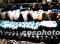<div=left>中緬警方合作在春季行動(dòng)中摧毀金三角一個(gè)毒品加工廠,繳獲大量毒品及槍支彈藥。圖為該次行動(dòng)中繳獲的部分制毒化學(xué)配劑。作者:張磊