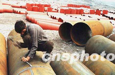 三峽重慶市庫區(qū)正抓緊時間對城市污水環(huán)境實施治理工程,全市將建19座污水處理廠,日處理污水51萬噸,主要分布在江津、涪陵、長壽、豐都、萬州、云陽、奉節(jié)等移民遷建城市。圖為奉節(jié)縣正在加工鑄造污水管道。作者:周會