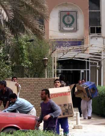 路透社記者看到伊拉克人群首先洗劫了設(shè)在巴格達運河賓館的聯(lián)合國駐伊拉克辦事機構(gòu)。另有一名目擊者稱,伊拉克劫掠者還在遭到美軍轟炸的伊拉克奧林匹克委員會大樓附近大肆搶掠各家體育用品商店里的貨物。