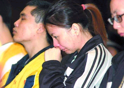 陳惠英穿著一套灰白相間的運動服,一條馬尾辮染成黃色,顯得十分時尚。她是麥國慶的妻子,今年才31歲,年輕的面容上帶著幾分憔悴。被押進(jìn)法庭時,她的腳步遲緩,怯生生地向旁聽席張望。