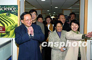 中國新任國務(wù)委員唐家璇十日在國務(wù)院僑辦主任陳玉杰陪同下,到中國新聞社考察指導(dǎo)工作時(shí),向中新社的新聞工作者表示致意。作者:毛建軍