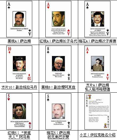 中新網(wǎng)4月12日電 據(jù)法新社報(bào)道,美國國務(wù)院當(dāng)?shù)貢r(shí)間周五發(fā)出了撲克牌形式的伊拉克高官“通緝令”。媒體報(bào)道稱撲克牌共有55張,其中52人為伊拉克官員名單,另外的3張為伊拉克人姓名等相關(guān)問題介紹。這些高官按撲克牌的次序依次列出,其中薩達(dá)姆與他的兩個(gè)兒子分別被定為黑桃、梅花和紅心A。方片A為薩達(dá)姆私人秘書哈穆德。據(jù)悉,撲克牌“通緝令”已經(jīng)發(fā)到美軍官兵手中。