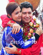 “二OO三阿迪力極限之旅”四月十六日在北京幕田峪長城舉行啟程儀式。“高空王子”阿迪力將進行極限表演。圖為阿迪力在臨行前與妻子相擁。作者:盛佳鵬