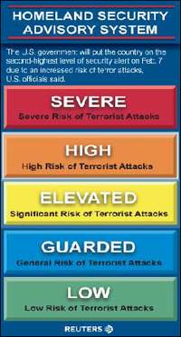 據(jù)路透社報道,自伊拉克戰(zhàn)爭開打以來,美國的國家恐怖警戒級別就一直處于第二強度的次最高級級別,即“橙色”“危急”級別。