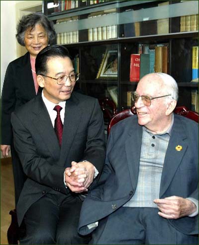中新網(wǎng)4月20日電 中共中央政治局常委、國務(wù)院總理溫家寶20日上午來到全國政協(xié)常委、外國老專家愛潑斯坦寓所,親切看望了愛潑斯坦同志,并代表黨中央、國務(wù)院祝賀他在華工作70年暨88壽辰。
