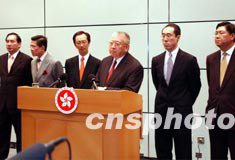 香港特首董建華連同政府高官,4月23日在政府總部宣布將推出118億港元的八項救市措施,紓緩SARS疫情對本港經(jīng)濟(jì)的影響。中新社傳真 洪少葵 攝