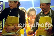 伊拉克人沙法(右)和他的德國朋友四月末在上海一家江浙菜餐廳“表演”廚藝。這家餐廳為了宣傳菜品,每周特請?jiān)谏虾5耐鈬笥央S意炒作中國菜,并從中評選“等級廚師”,而沙法等外國人也從中獲得新鮮樂趣。作者:劉殊瑾