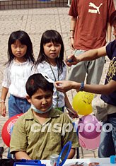 小朋友紛紛暫且放下口罩參與噴畫攤位的化妝游戲。洪少葵 攝