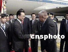 中國(guó)總理溫家寶二十九日上午飛抵泰國(guó)首都曼谷,準(zhǔn)備出席關(guān)于非典型肺炎問(wèn)題的中國(guó)——東盟領(lǐng)導(dǎo)人特別會(huì)議。圖為香港特首董建華在機(jī)場(chǎng)迎接溫家寶總理。中新社圖