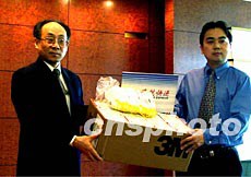 美國紐約哥倫比亞大學(xué)中國學(xué)生學(xué)者聯(lián)誼會購買了五千只世界衛(wèi)生組織推薦的N九五防護口罩,贈送給戰(zhàn)斗在抗擊非典型肺炎第一線的中國醫(yī)務(wù)工作者。二十九日哥大學(xué)生代表將口罩樣品和捐贈清單交給中國駐紐約總領(lǐng)事張宏喜(左)。作者:趙海燕