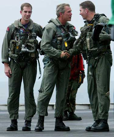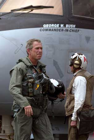 暗藏玄機之四,布什政府未來行動之四:布什乘戰(zhàn)機上航母做演講這一系列動作顯然還有明顯的國內(nèi)政治意圖。美國《紐約時報》聲稱,讓布什上航母演講除了是撈最大程序的政治影響之外,沒有其它的解釋。布什總統(tǒng)被充滿笑臉的美國大兵包圍的情景顯然是2004年競選連任最佳的布景。勑路迹