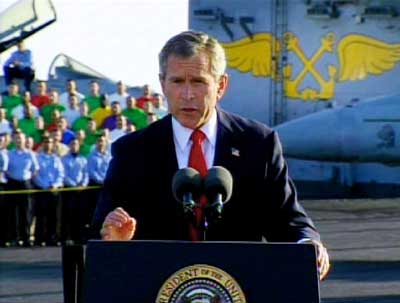 在充滿感情的言辭中,布什不僅僅稱贊推翻薩達姆政權(quán)的美軍官兵,更是大講特講“9-11”恐怖襲擊,從而將伊拉克戰(zhàn)爭與反恐戰(zhàn)爭融為一體,布什用充滿感情的言辭說:“我們不應(yīng)該忘記9-11遇難的人們,不應(yīng)該忘記遇難者們打的最后一個電話,不應(yīng)該忘記孩子們慘遭冷酷的謀殺,不應(yīng)該忘記在廢墟中搜尋的日子。因為這些恐怖襲擊,因為恐怖分子和支持者們向美國宣戰(zhàn),所以他們也得到了戰(zhàn)爭的報應(yīng)!辈际策用強硬的措辭警告任何“與恐怖組織有關(guān),試圖擁有大規(guī)模殺傷性武器的無法無天的國家”,它們對“文明世界形成了嚴(yán)重的威脅,一定會遭到抵抗的!辈际策@番話顯然是在直接警告伊朗等國家,并且暗示美國同樣敢對它們采取行動。
