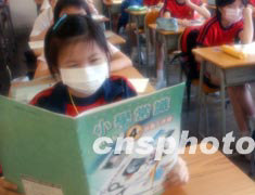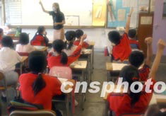 隨著香港“SARS”疫情的逐漸穩(wěn)定,香港數(shù)百所小學的高年級學生五月十二日開始復課。在灣仔學校復課的第一天,老師向學生提問有關如何防預“SARS”的基本知識。中新社記者 錢興強 攝