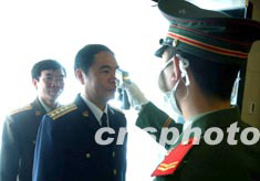 北京武警士兵五月在小湯山解放軍野戰(zhàn)醫(yī)院嚴查官兵的體溫,保證軍方的一批博士和碩士醫(yī)學專家在抗擊“非典”的戰(zhàn)役中安然無恙。中新社記者:賈國榮