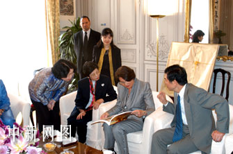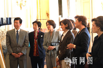 拉法蘭總理夫人一進大門,就對迎候的中國駐法大使吳建民和夫人施燕華公參說:“訪問中國是我的一個愿望。由于中國目前發(fā)生的特殊情況,我沒能于上月隨同丈夫一起訪華,感到非常遺憾。今天我把原本要一同訪華的所有夫人們帶到這里,參觀巴黎的中國---新近成立的巴黎中國文化中心,也是了卻一個心愿!