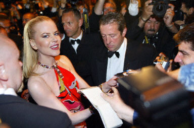 19日,丹麥導演馮特里爾的影片《道格鎮(zhèn)》(Dogville)在戛納電影宮的盧米埃爾大廳放映。影片劇組在首場記者觀摩后舉行了新聞發(fā)布會,導演馮特里爾(中)、女主角妮可-基德曼(左)等出席了記者會。