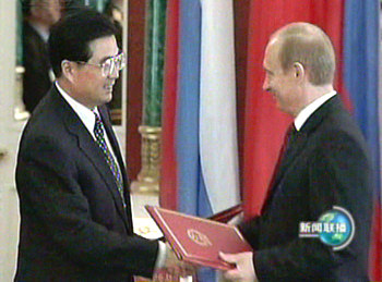 今天是胡錦濤主席訪俄的第二天。當(dāng)?shù)貢r間今天上午,胡錦濤主席向無名烈士墓敬獻了花圈,并參觀了俯首山衛(wèi)國戰(zhàn)爭博物館。中午,普京總統(tǒng)在克里姆林宮為胡錦濤主席舉行了歡迎儀式并進行小、大范圍會談。會談結(jié)束后,兩國元首簽署了中俄聯(lián)合聲明等三個文件。
