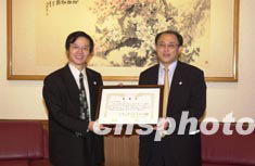 日本中華總商會(huì)28日捐資六百五十萬日元,支持中國(guó)抗擊非典型肺炎。圖為在捐款儀式上,中國(guó)駐日使館總領(lǐng)事張立國(guó)向總商會(huì)會(huì)長(zhǎng)顏安(左)頒發(fā)感謝狀。中新社記者:陶光雄