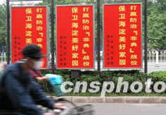 進(jìn)入五月下旬以來(lái),北京“非典”疫情逐步下降,在北京疫情較重的海淀區(qū),醒目的街頭公益廣告提醒人們防“非典”不松懈。中新社記者:張勤