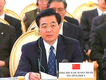 在金碧輝煌的亞歷山大廳,東道國(guó)俄羅斯總統(tǒng)普京、輪值主席國(guó)哈薩克斯坦總統(tǒng)納扎爾巴耶夫、首次出席峰會(huì)的中國(guó)國(guó)家主席胡錦濤和吉爾吉斯斯坦總統(tǒng)阿卡耶夫、塔吉克斯坦總統(tǒng)拉赫莫諾夫、烏茲別克斯坦總統(tǒng)卡里莫夫,圍坐在圓桌邊,按照俄文字母順序先后發(fā)言。