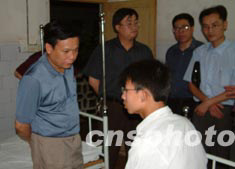 廣東省始興中學(xué)六月一日發(fā)生學(xué)生集體食物中毒意外,有五十五名中學(xué)生因食用不潔食品引起細(xì)菌性食物中毒。到六月二日下午,仍有十五人需留院觀察治療,但已確定無生命危險(xiǎn)指征。圖為中共始興縣委書記馮壽宗在醫(yī)院病房看望中毒學(xué)生。作者:馮昶