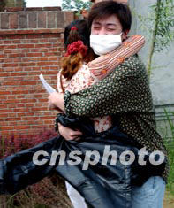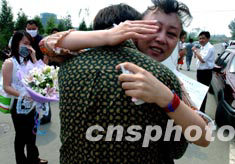 北京一位母親六月三日上午在小湯山戰(zhàn)地醫(yī)院門前,終于盼到患“非典”住院一個多月的兒子痊愈出院,母子頓時激動地緊緊擁抱在一起。中新社記者:賈國榮