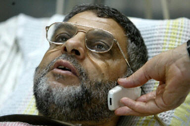 6月10日,被以色列武裝直升機炸傷的巴勒斯坦伊斯蘭抵抗運動(哈馬斯)發(fā)言人蘭提斯在加沙城一所醫(yī)院里通過電話與外界聯(lián)系。
