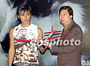 歌星謝霆鋒6月11日在香港舉行新碟發(fā)布會(huì),英皇娛樂(lè)高層吳雨向霆鋒送上模型飛機(jī),祝賀其歌唱事業(yè)將一飛沖天。鄧慶樂(lè) 攝