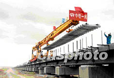 六月十二日清晨,青藏鐵路鋪軌順利通過海拔四千六百多米、全長十一點(diǎn)七公里的清水河特大橋。清水河特大橋位于可可西里無人區(qū),是青藏鐵路最長的以橋代路工程和重點(diǎn)控制工程之一!耙詷虼贰敝饕菫榻鉀Q高原凍土地帶路基穩(wěn)定問題,各橋墩間的一千三百多個(gè)橋孔可供藏羚羊等野生動(dòng)物自由遷徙。作者:趙匡胤