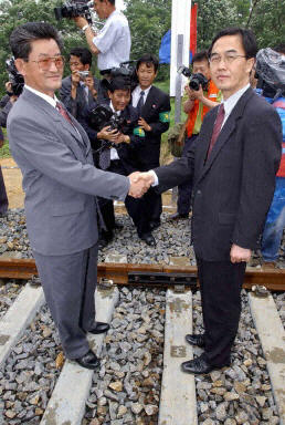 中新網(wǎng)6月14日電 據(jù)《韓國時(shí)報(bào)》報(bào)道,朝鮮和韓國的兩條鐵路今天終于相聯(lián)了,這使兩國的鐵路聯(lián)系變成可能,而不是像以前只能通過海上線路聯(lián)系。雙方共有100來個(gè)代表參加了聯(lián)接慶典。