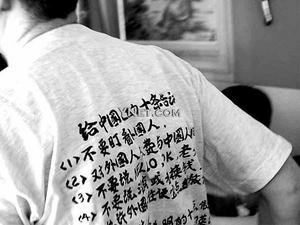 據(jù)《現(xiàn)代快報(bào)》報(bào)道,該外籍男子當(dāng)時(shí)身著一件后背印有字跡的T恤,上面寫著“給中國(guó)人十條告誡”,如“(1)不許盯看外國(guó)人,(2)不要跟外國(guó)人說(shuō)HELLO、OK,(3)允許外國(guó)人住便宜旅館”等內(nèi)容。在場(chǎng)的兩位市民許先生和陳先生對(duì)“老外”T恤上的文字表示不滿,當(dāng)即上前讓其脫下該衣服,在場(chǎng)的其他市民也紛紛附和。