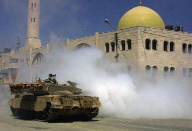 6月17日,在約旦河西岸納布盧斯附近的阿斯卡爾難民營里,一輛以色列坦克在一座清真寺前駛過。在當(dāng)天這一地區(qū)發(fā)生的巴以沖突中,以色列軍隊(duì)開槍打傷兩名巴勒斯坦人。